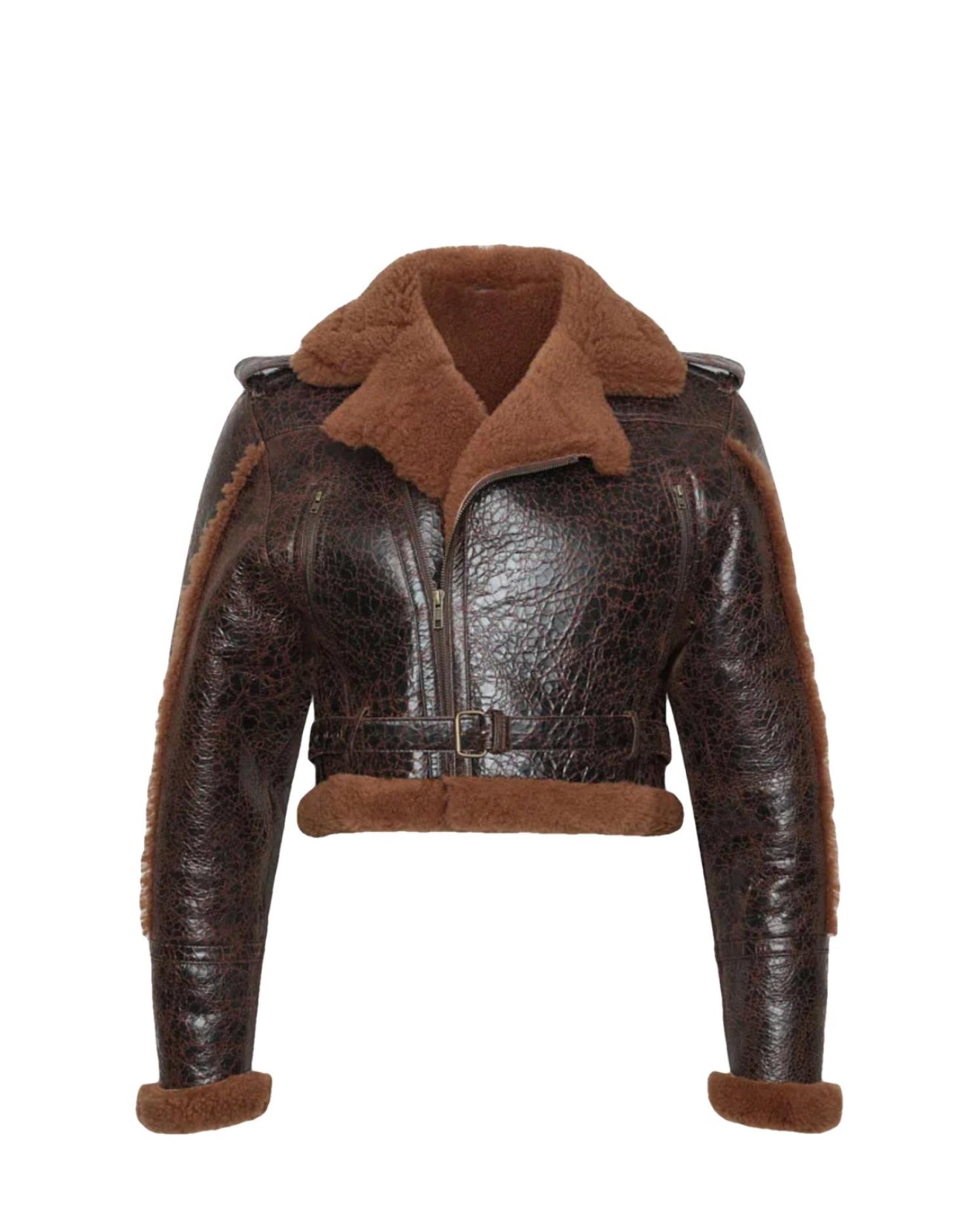 A sculptural, cold-weather essential designed for impact. This semi cropped aviator jacket blends cracked espresso-brown leather with plush chestnut shearling, creating a rich contrast that feels both vintage and unmistakably modern. It’s statement outerwear that elevates everything — denim, trousers, slip skirts, or your go-to KOIR basics.