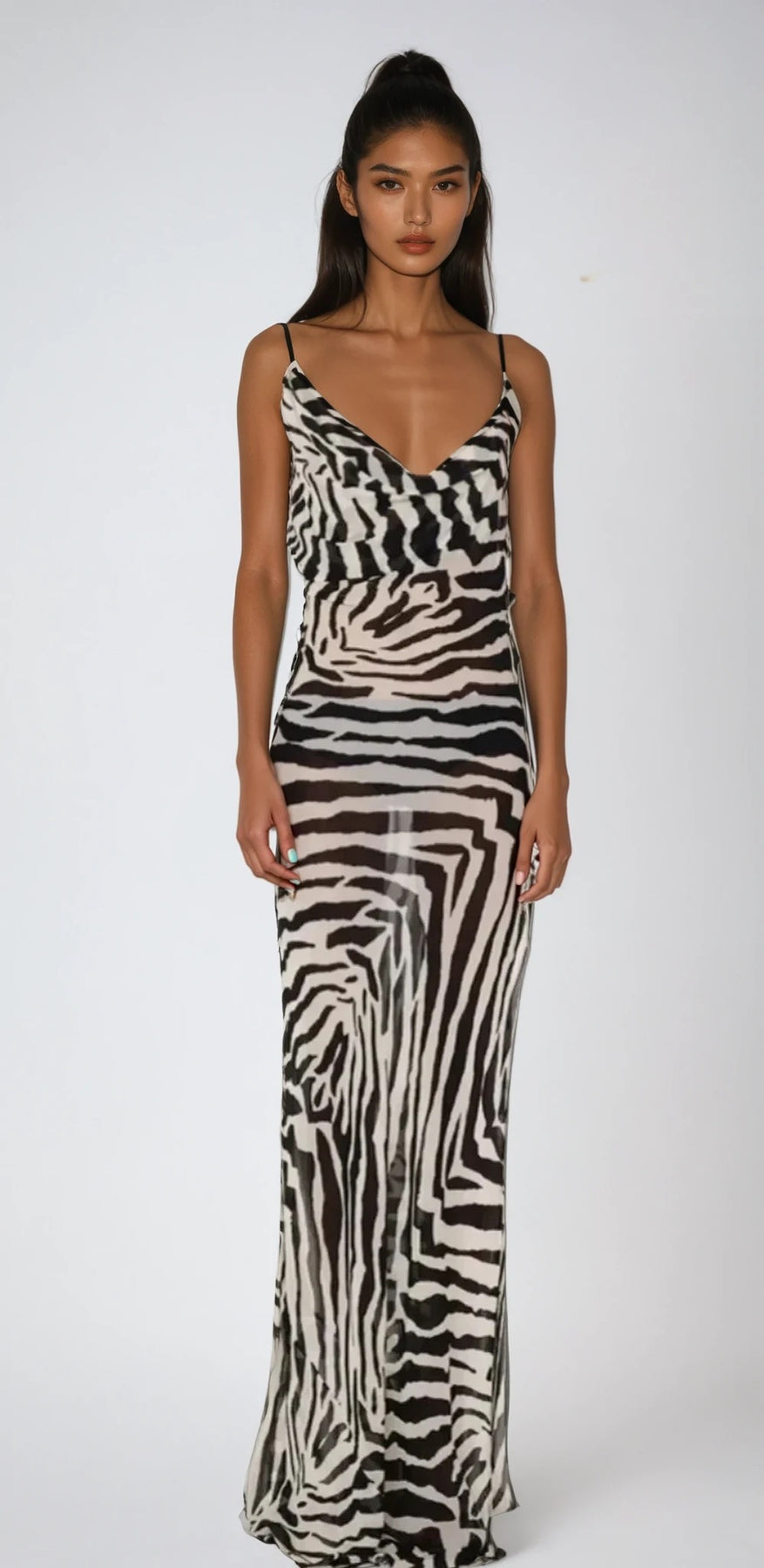 The zebra-inspired print — in refined shades of ivory and inky black — gives the gown an instantly iconic edge. It’s the perfect blend of wild femininity and minimalist sophistication, making it a statement piece for nights out, destination dinners, and elevated events where confidence is the dress code.